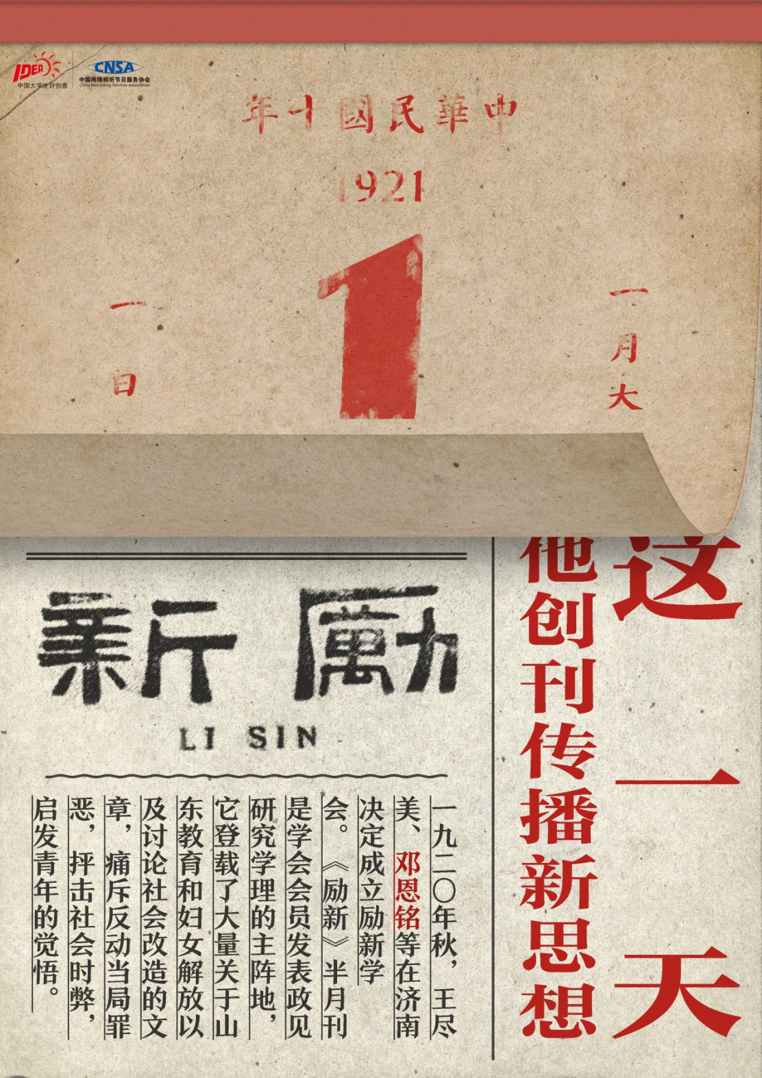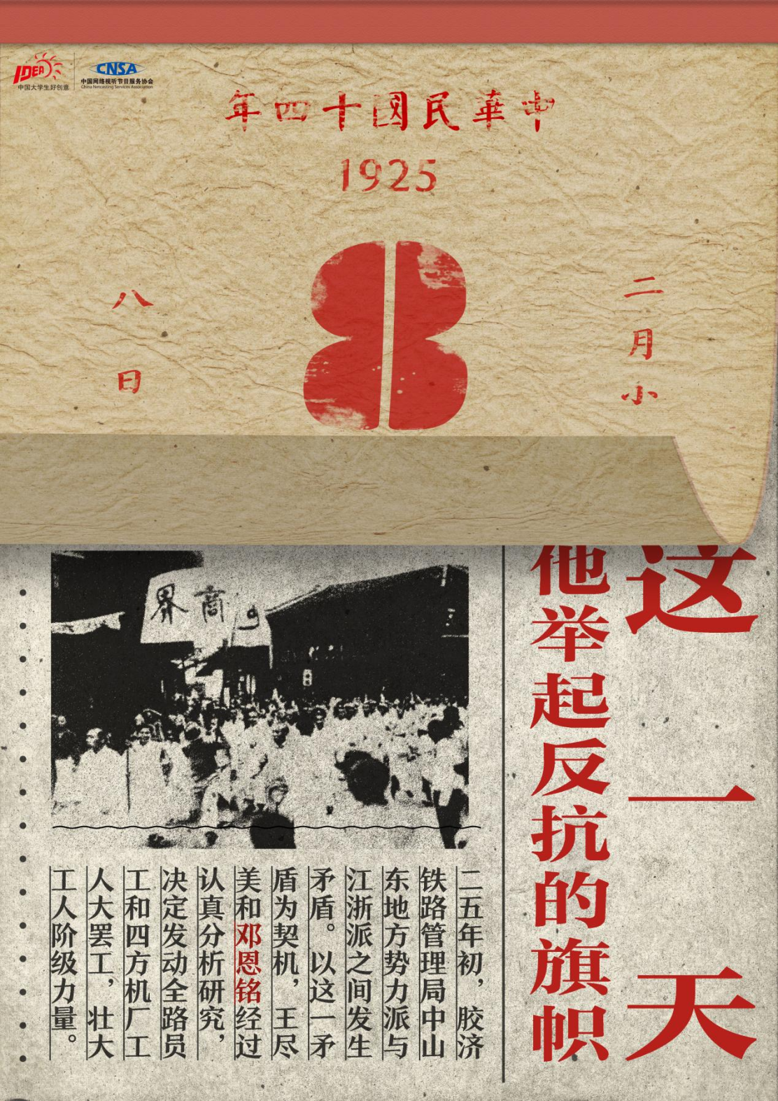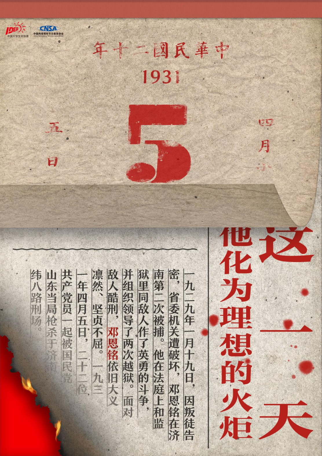 作为中共一大13位代表之一,邓恩铭为马克思主义在中国的传播、工人运动的开展、解放妇女思想的宣传等做出了卓越的贡献。1931年慷慨就义时,他年仅30岁,我们应该铭记这位英雄。作品采用“日历+报纸”的形式记录了邓恩铭同志一生中的重要时刻,翻开一页日历,我们看到的是邓恩铭同志的一次次斗争,系列中的第三幅燃着的报纸边缘露出的是国旗红,英雄虽牺牲,事迹永铭记。