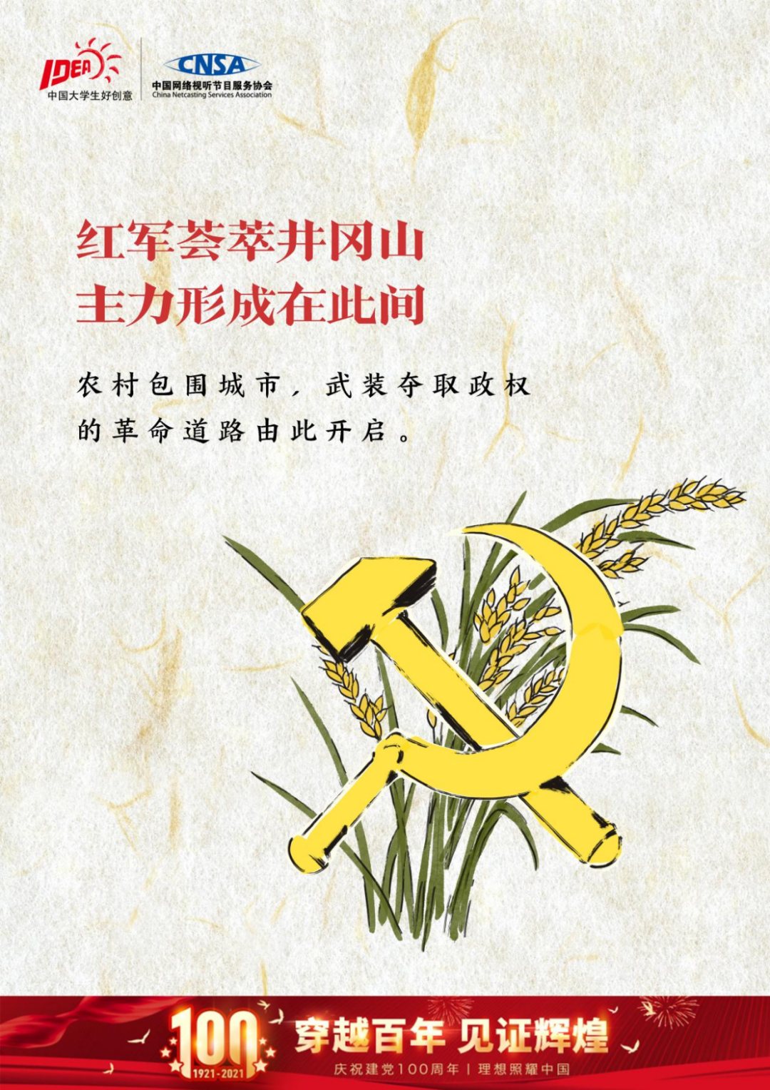 以三组分别代表政治、军事和人民三个方面的剪影为画面的主要部分;呈现和回顾中国共产党在百年历史中为中国作出的贡献。主要色调为红色和黄色,与党的主色调相符,让观者能够感受到党的光辉。是回顾,也是传承,红色的飘带扬起的便是我们对未来的展望,100年,初心不变,我们要带着动人的故事继续前行。
