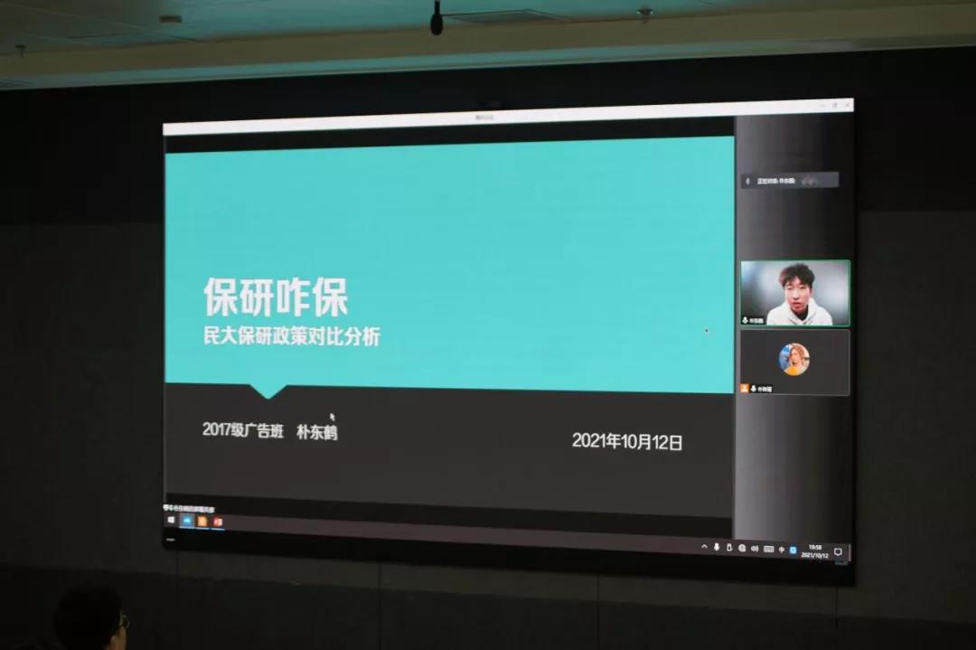 、现远在西藏支教的2017级广告班朴东鹤同学通过视频连线的方式向同学们阐述了民大保研的相关政策。“保研=推免+接收”,而学长重点介绍了“推免”。五种推免类型中,学长重点讲述了普通保研,特殊创新人才保研,支教保研三种方式,解释了保研需要的个人平时成绩及表现和专业内推免名额分配,举例了保研需要的一类奖和二类奖的奖项,并提醒同学们要及时获取实时消息。最后他激励同学们为自己的目标加以努力。