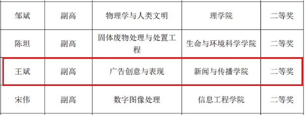 由吴占勇老师主讲的“新闻学理论”课程入围现场说课。吴占勇老师在15分钟时间内,分别从课程总体创新设计和“新闻价值”章节的具体设计为例,清晰全面地展示了一线课堂的讲授思路、方法和效果,最终获得中级及以下组第一名。王斌老师建设的“广告创意与表现”课程、刘瑾鸿老师建设的“媒介经营与管理”课程,均受到评审专家的肯定。