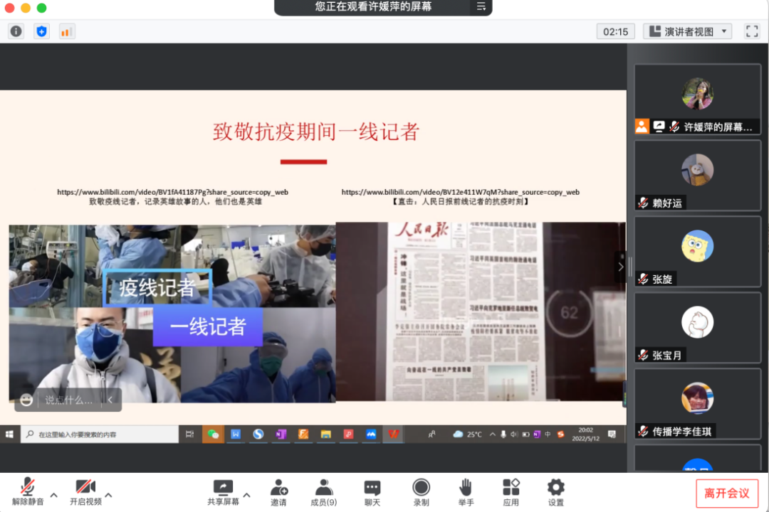 5月12日,2020级研究生第一党支部围绕“致敬抗疫一线的记者”“抗疫影片分享”“抗疫志愿者故事分享”“支部成员手写抗疫祝福和漫画创作”等内容开展此次主题党日。