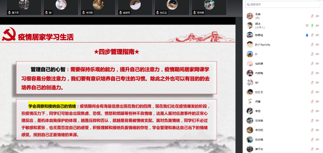 会议最后,支部书记胡冰同志建议党员同学们能够增强体力、管理精神、管理心智、学会洞察和接纳自己的情绪,以积极的心态面对疫情,同时号召支部大家积极投身于身边的志愿服务工作。