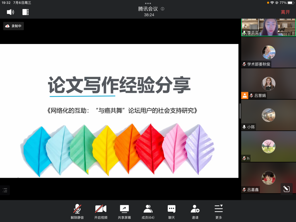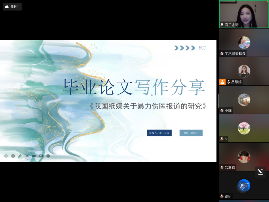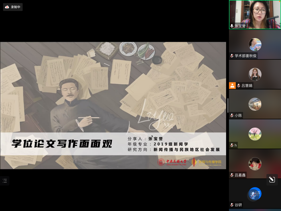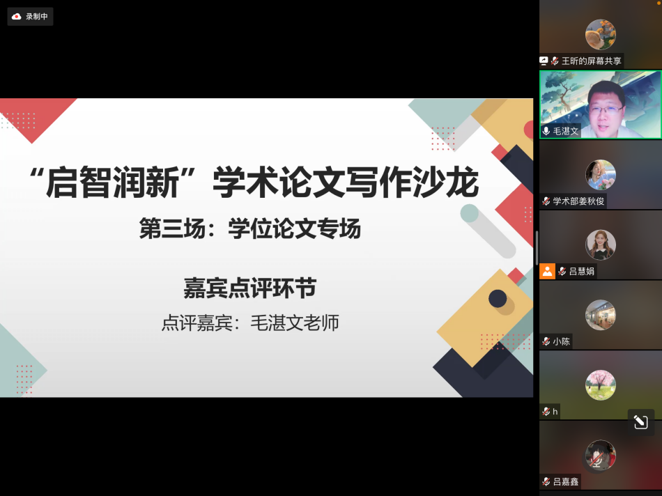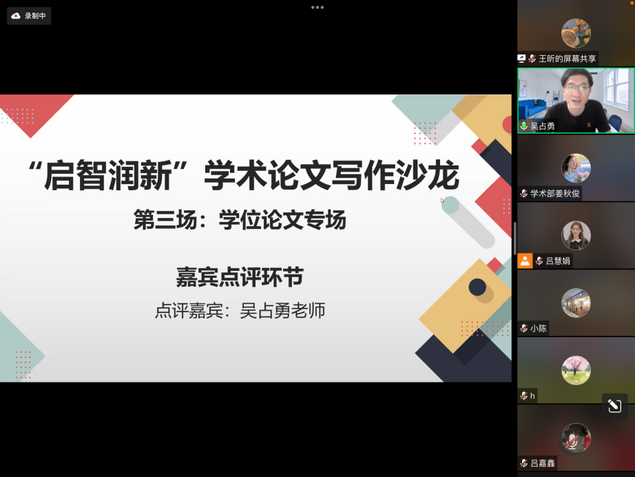 研究生会主办的“启智润新”学术论文写作沙龙第三场——“学位论文专场”在云端顺利举办。学术论文写作沙龙活动旨在促进朋辈相互激励,搭建沟通桥梁,提升研究生学术素质,营造良好的学术氛围。本次活动吸引了80余名同学参加。