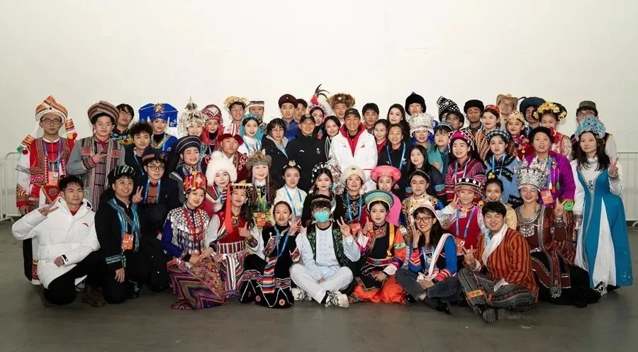 (图为各民族代表与总导演张艺谋合影)